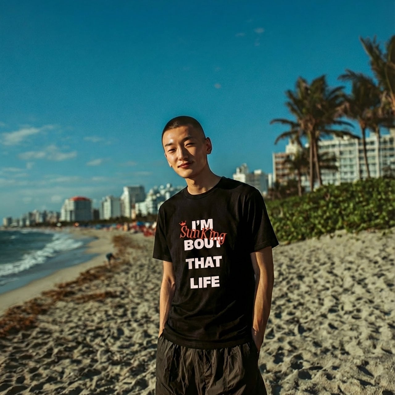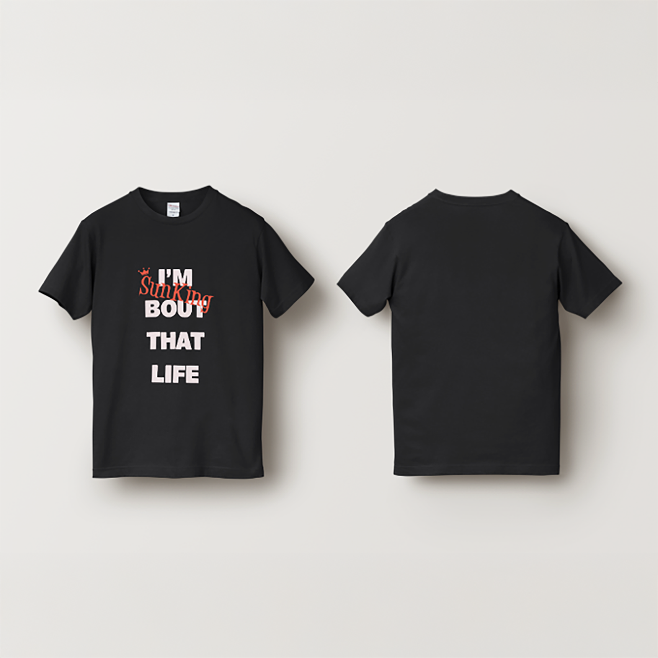 "I'M BOUT THAT LIFE"(私はこの生き方にこだわっている)というメッセージに、ブランドの象徴である「SunKing」のロゴを重ねた、力強いメッセージTシャツです。