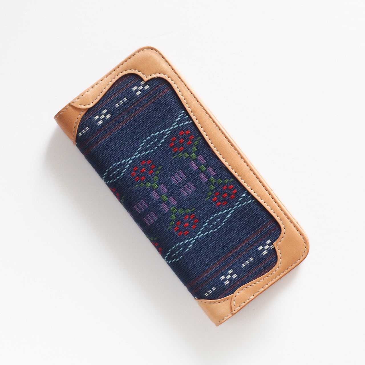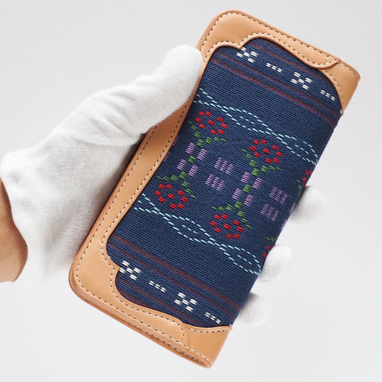 ポップで可愛らしい柄が目を引く、読谷山花織を使ったロングウォレットです。読谷山花織は、およそ600年もの歴史を持つ沖縄の伝統的な織物。明治の中頃には一度衰退してしまいましたが、1964年、読谷村の有志たちの手によって90年ぶりに復活した「幻の花織」として、今も多くの人に愛されています。